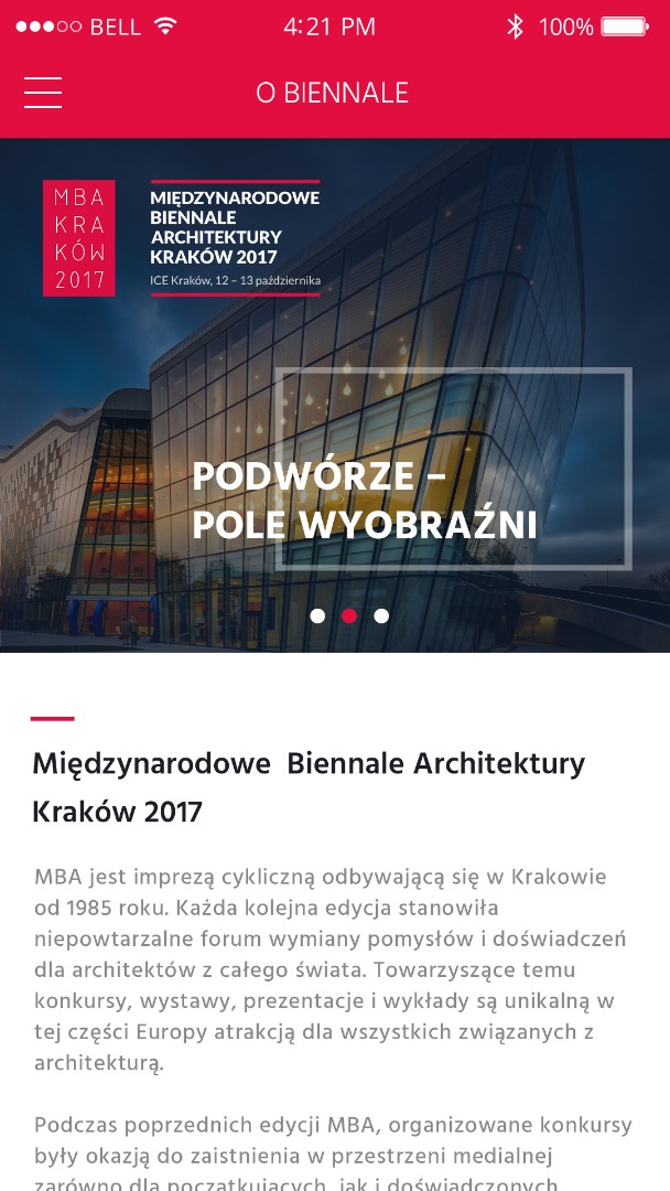 "(...)Zastosowanie aplikacji MBA 2017 udostępniło uczestnikom bezzwłoczny dostęp do bieżących informacji, zapewniając płynność komunikacji pomiędzy Organizatorem a gośćmi Biennale. Wysoka liczba pobrań oraz pozytywne opinie na temat aplikacji MBA 2017 umacniają nas w przekonaniu, że była ona niezwykle istotnym narzędziem organizacyjnym. Powyższe to efekt dobrej współpracy z firmą 3Step Sp. z o.o. Wszystkie prace zostały wykonane z należytą starannością. Firma 3Step Sp. z o.o. aktywnie uczestniczyła w poszczególnych etapach realizacji projektu służąc pomocą i cennymi wskazówkami. Projekt został wykonany terminowo i rzetelnie. Polecamy firmę 3Step Sp. z o. o. jako twórcę aplikacji mobilnych (...)"
